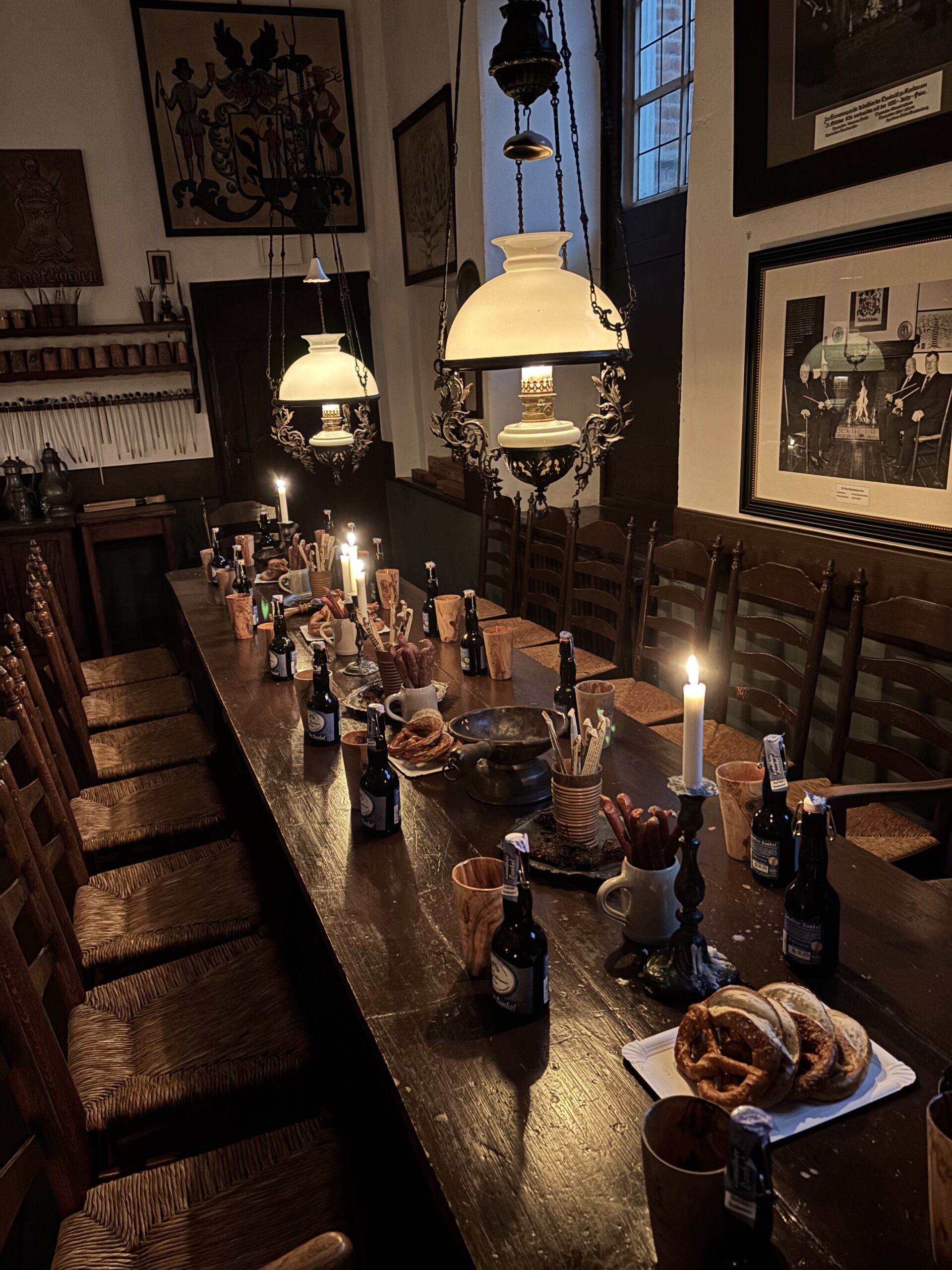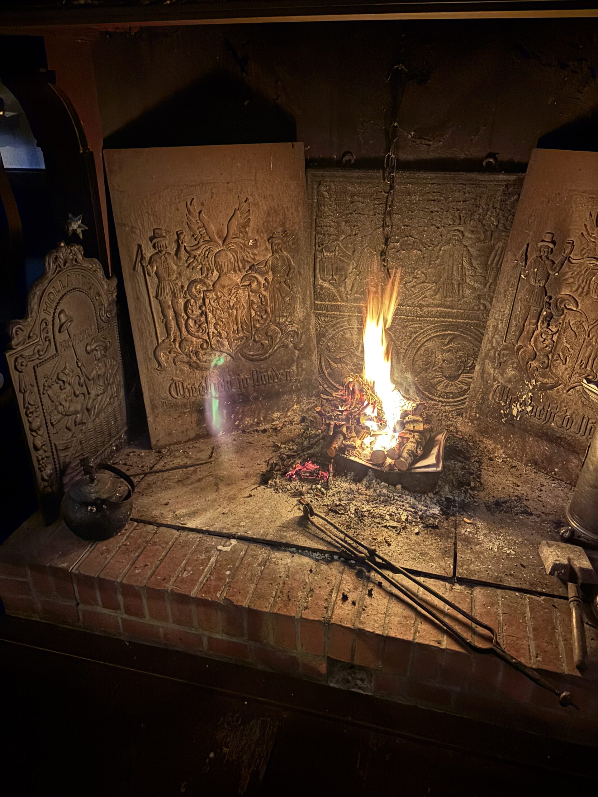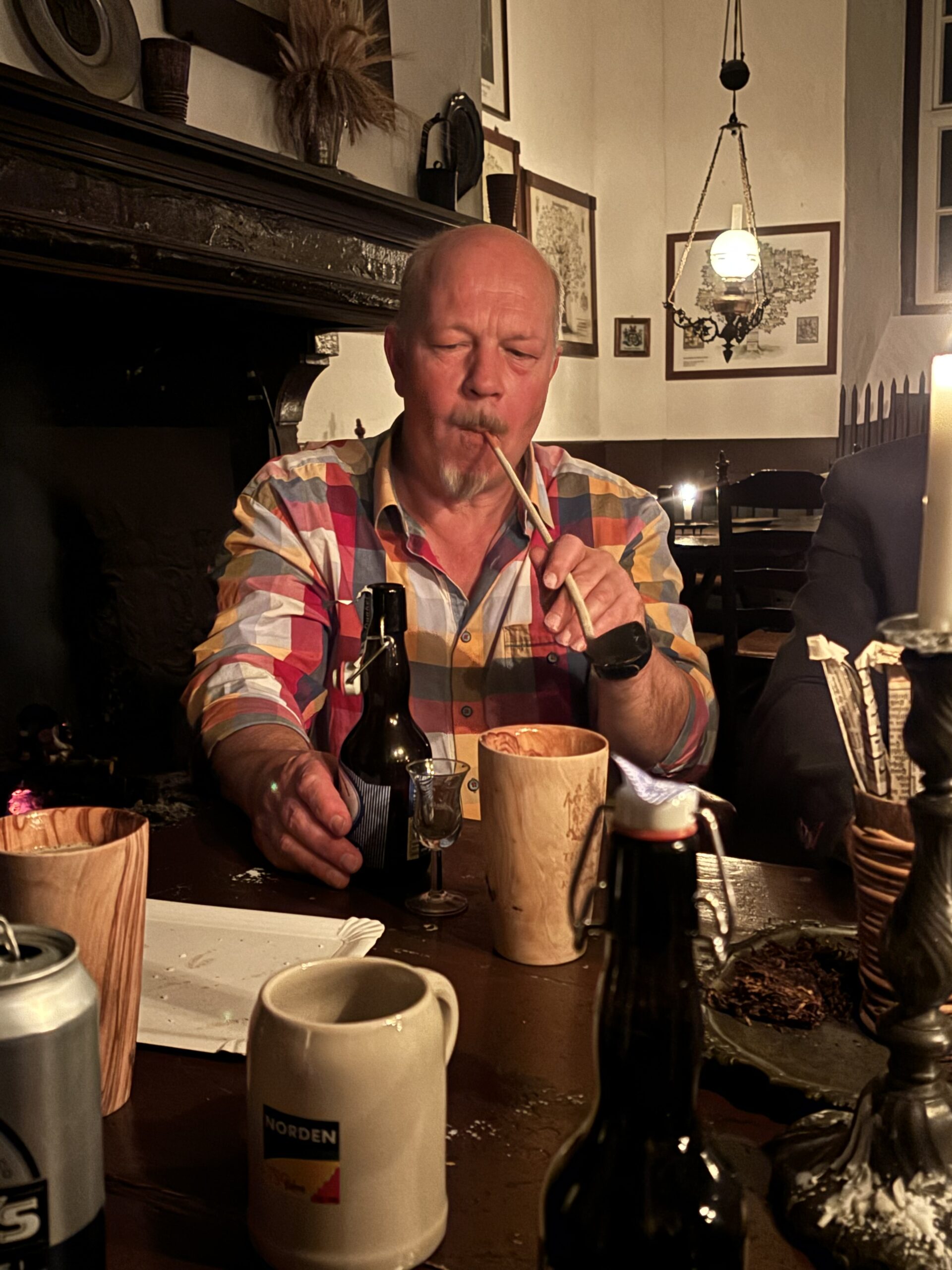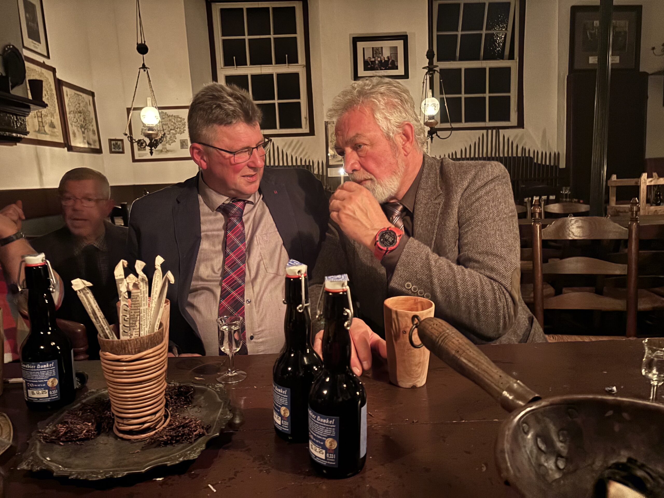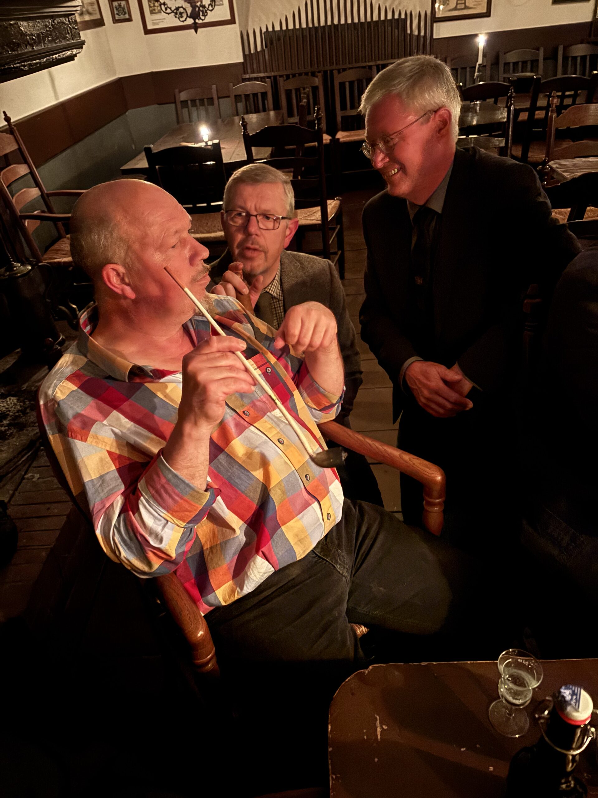 Der Theelachts-Bote hatte alles aufs Beste bestellt. Der Kamin („Heerdfüür“) brannte, die Tonpfeifen rauchten und das Bier wurde in den Holzbechern angeboten. Es kam ein lebhaftes Gespräch auf, unterbrochen von originellen Text-Vorträgen in plattdeutscher Sprache.
